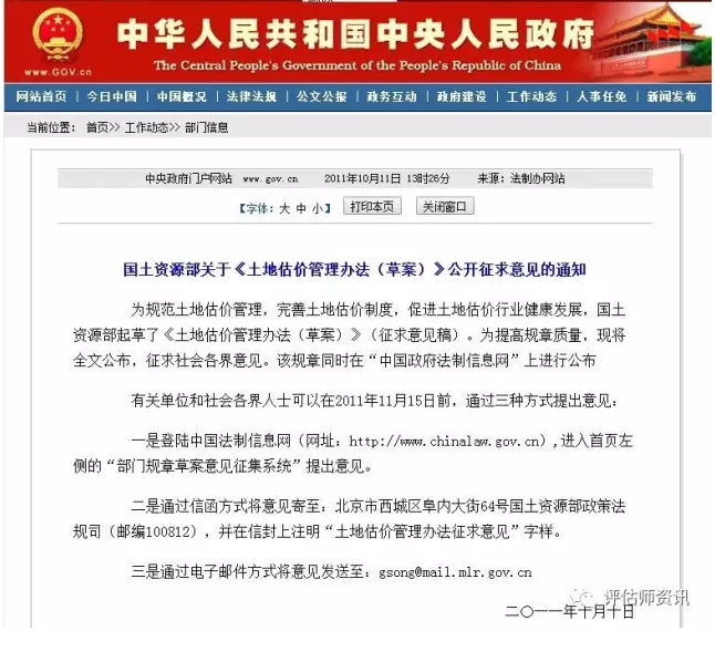 2011年10月,國土資源部辦公廳就《土地估價管理辦法(草案)》在法制信息網(wǎng)、國土資源部網(wǎng)站等向社會公開征求意見。征求意見稿主要對土地估價師執(zhí)業(yè)登記與注銷,土地估價師的權利與義務,土地估價機構的設立與執(zhí)業(yè)注冊,土地估價報告的備案與抽查,土地估價活動規(guī)范管理,土地估價師協(xié)會法律地位和法律責任等內(nèi)容做了規(guī)定。明確了土地估價師資格與執(zhí)業(yè)資格的取得方式、落實對土地估價機構的監(jiān)督管理、規(guī)范土地估價活動和強化土地估價報告質(zhì)量監(jiān)督等內(nèi)容。但在該辦法出臺前夕,由于各種原因而擱置。